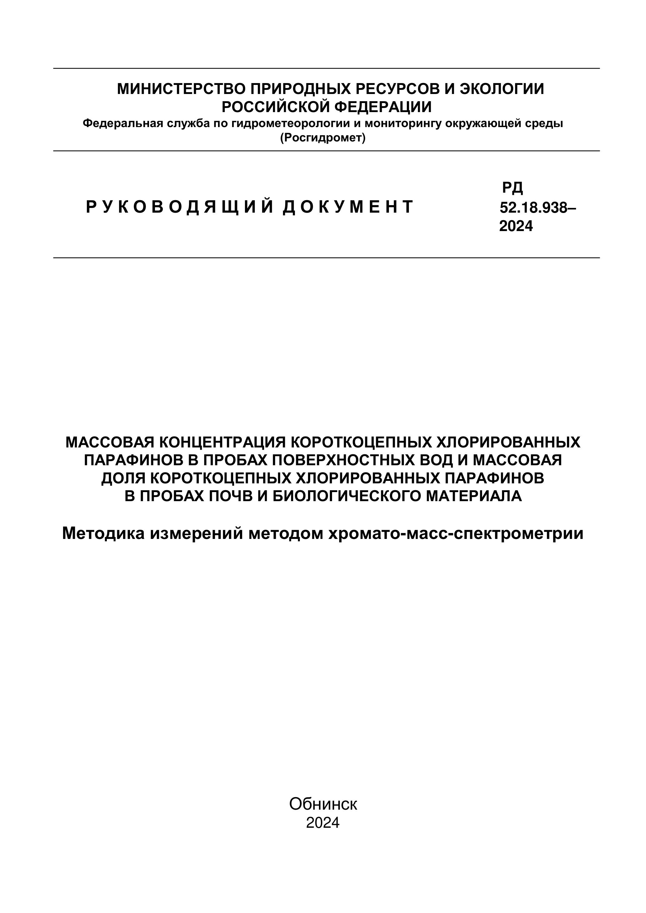 РД 52.18.938-2024 Массовая концентрация короткоцепных хлорированных парафинов в пробах поверхностных вод и массовая доля короткоцепных хлорированных парафинов в пробах почв и биологического материала. Методика измерений методом хромато-масс-спектрометрии [Текст] : Руководящий документ РД 52.18.938-2024 / ФГБУ "Научно-производственное объединение "Тайфун", 2024. - 34 с.