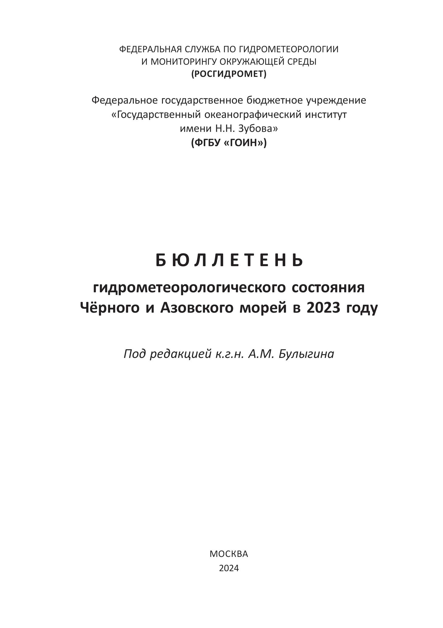 Бюллетень гидрометеорологического состояния Черного и Азовского морей в 2023 году [Текст] : монография / ФГБУ "Государственный океанографический институт имени Н. Н. Зубова", 2024. - 208 с.