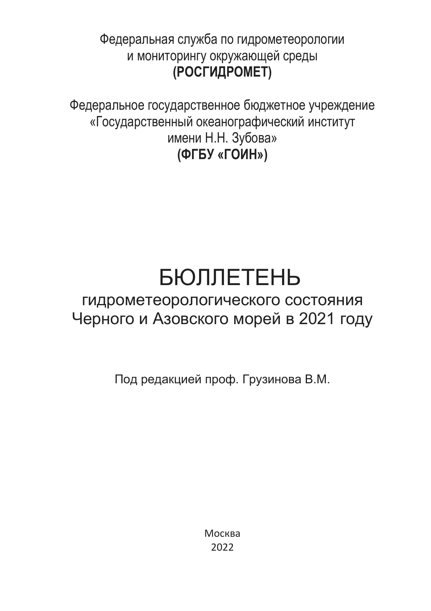 Бюллетень гидрометеорологического состояния Черного и Азовского морей в 2021 году [Текст] : ежегодник / Федеральное государственное бюджетное учреждение "Государственный океанографический институт имени Н.Н.Зубова" (ФГБУ "ГОИН"), 2022. - 268 с.