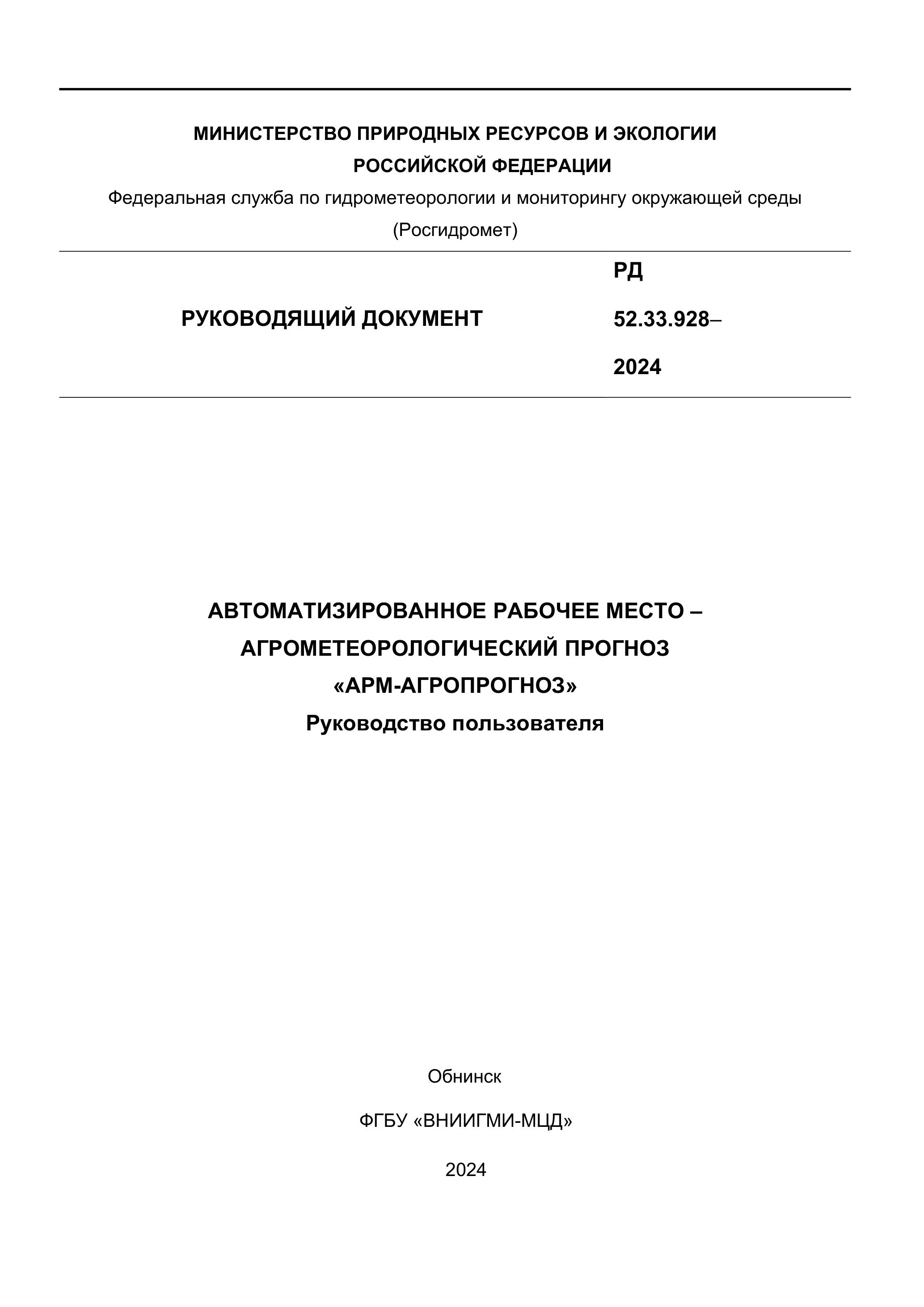 РД 52.33.928-2024 Автоматизированное рабочее место – агрометеорологический прогноз "АРМ-Агропрогноз". Руководство пользователя [Текст] : Руководящий документ РД 52.33.928-2024 / ФГБУ "Всероссийский научно-исследовательский ин-т сельскохозяйственной метеорологии", 2024. - 48 с.