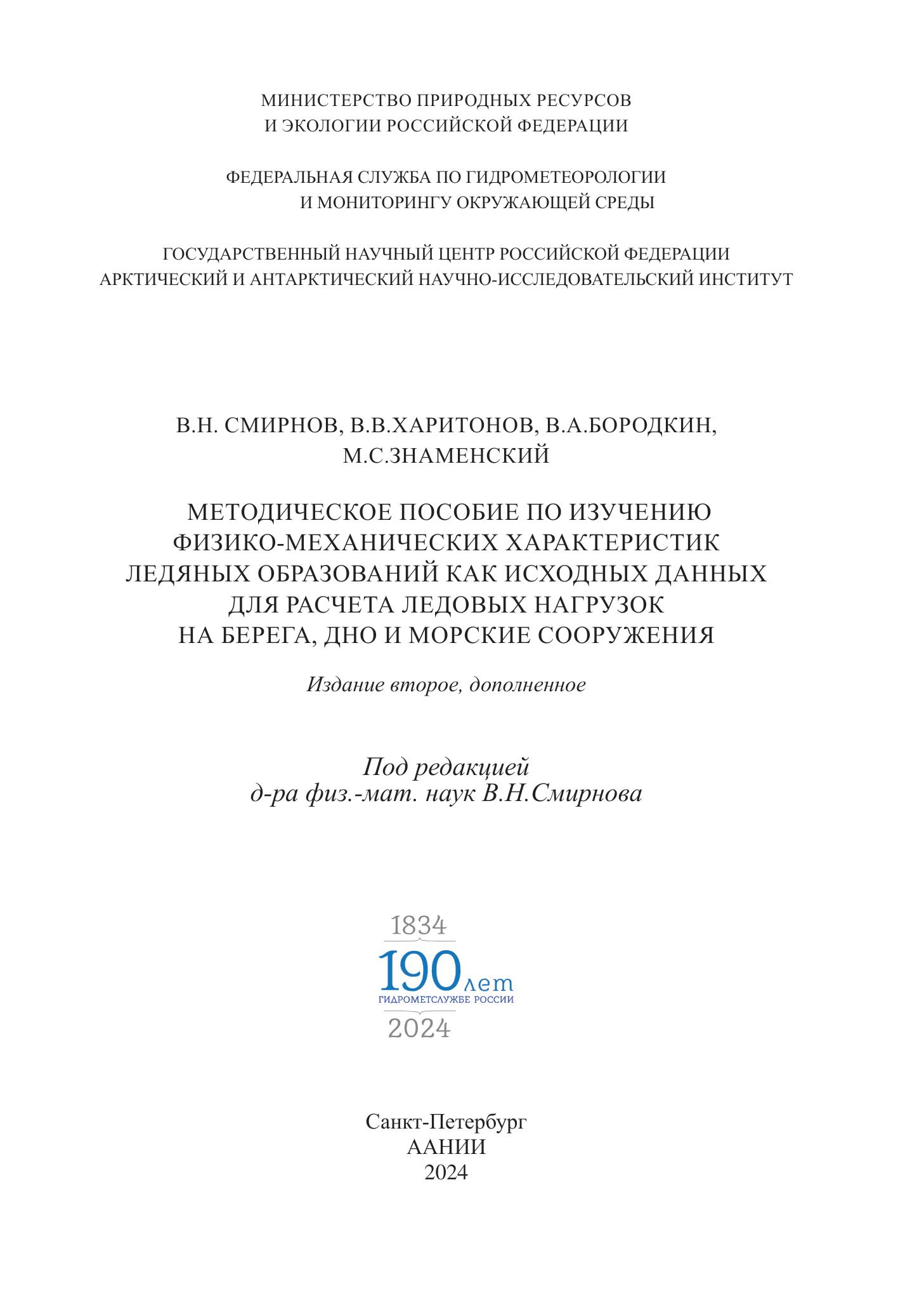 Смирнов В. Н. Методическое пособие по изучению физико-механических характеристик ледяных образований как исходных данных для расчета ледовых нагрузок на берега, дно и морские сооружения [Текст] : Издание второе, дополненное / В. Н. Смирнов, В. В. Харитонов, В. А. Бородкин, М. С. Знаменский, 2024. - 198 с.