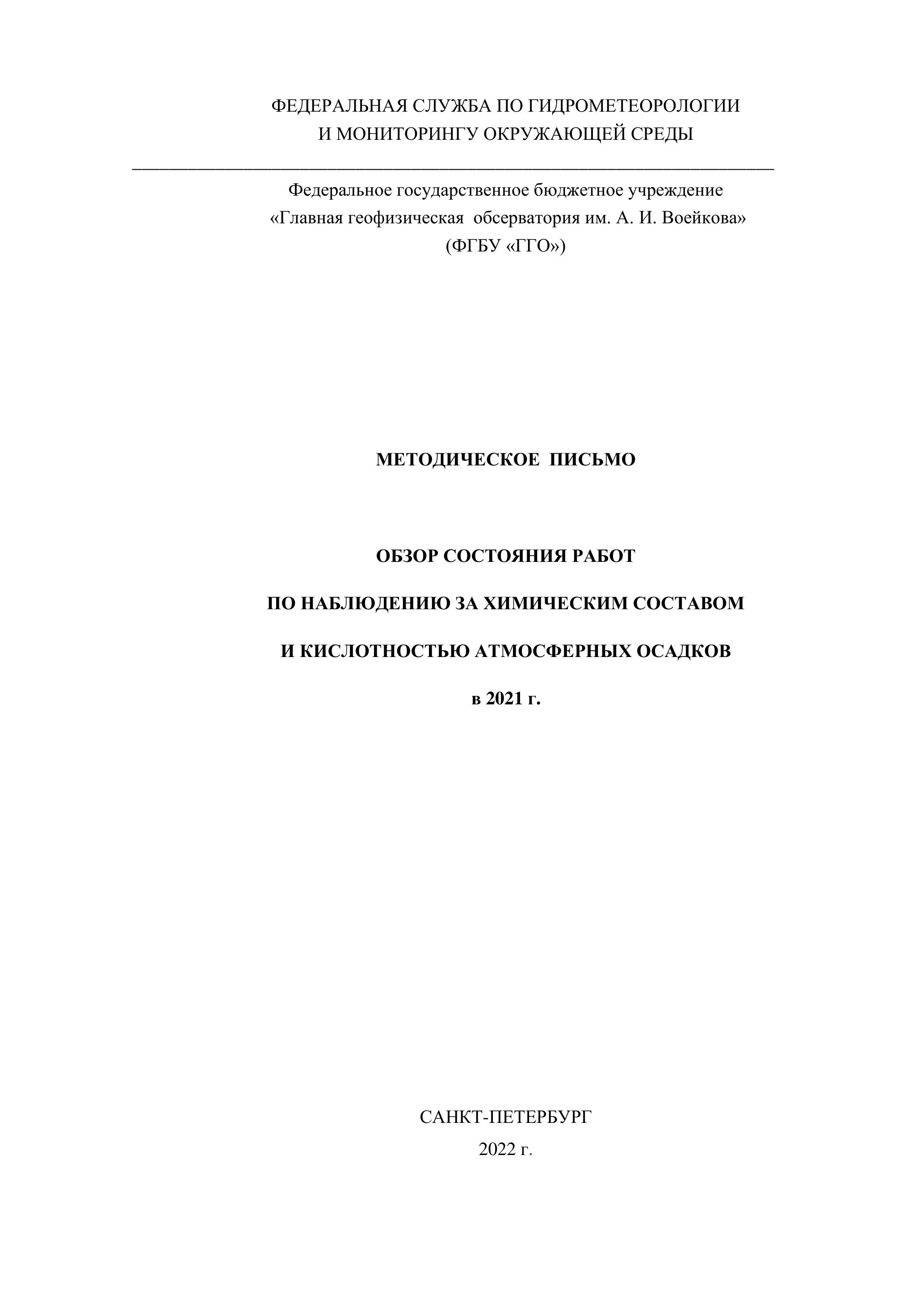 Методическое письмо. Обзор состояния работ по наблюдению за химическим составом и кислотностью атмосферных осадков в 2021 г. [Текст] : методические рекомендации / ФГБУ "Главная геофизическая обсерватория им. А. И. Воейкова", 2022. - 65 с.
