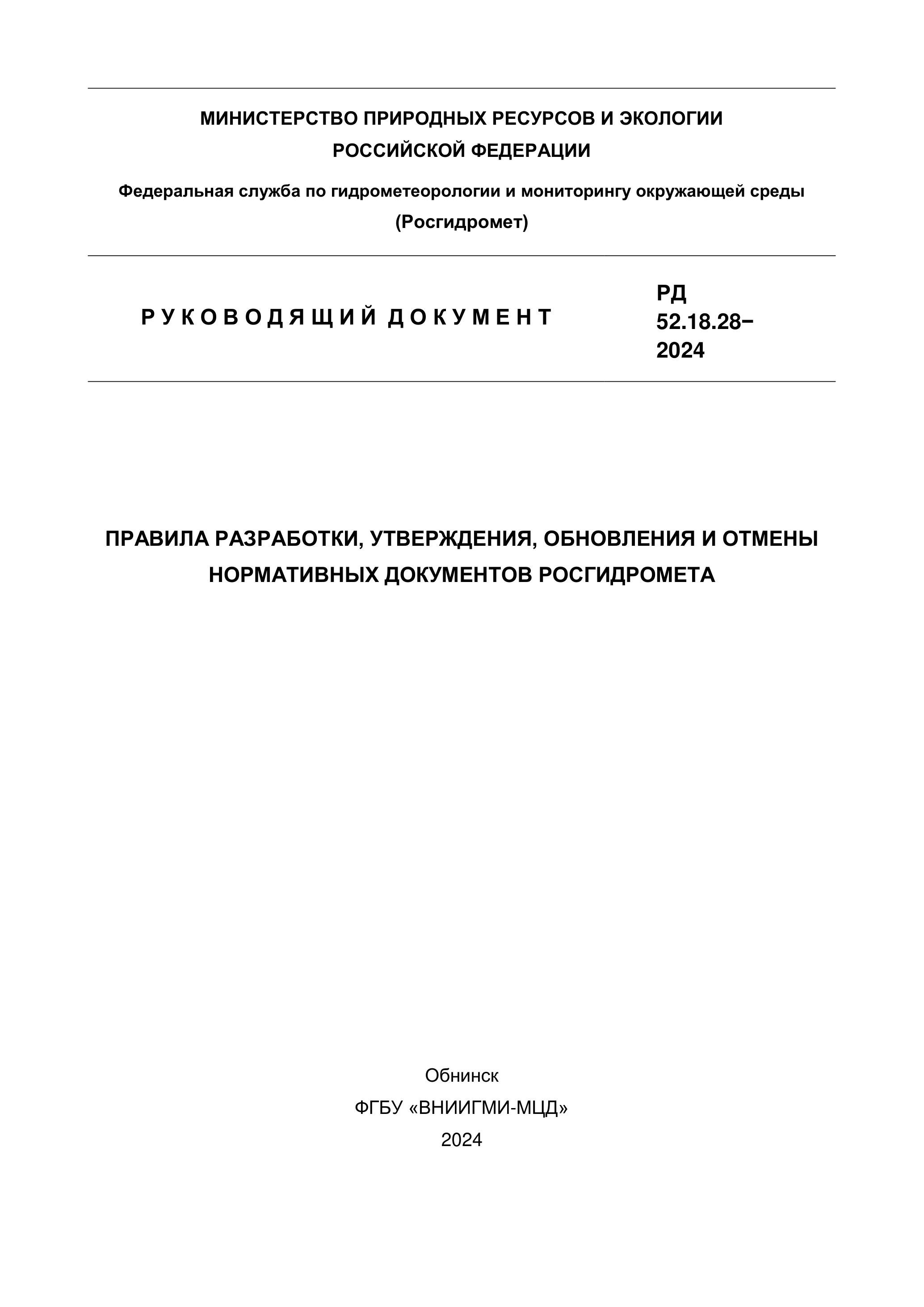 РД 52.18.28-2024 Правила разработки, утверждения, обновления и отмены нормативных документов Росгидромета [Текст] : Руководящий документ РД 52.18.28-2024 / ФГБУ "Научно-производственное объединение "Тайфун", 2024. - 65 с.