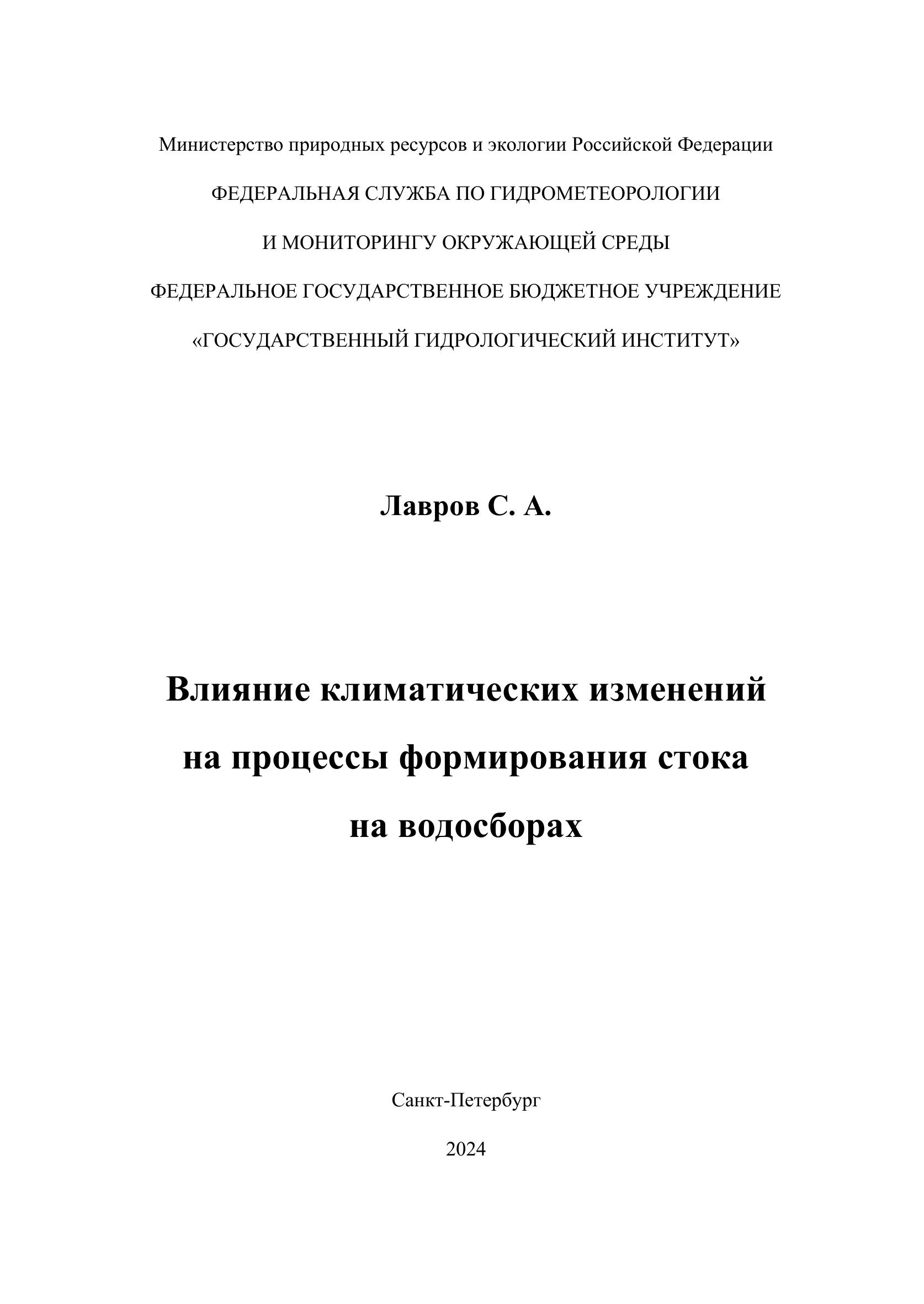 Лавров С. А. Влияние климатических изменений на процессы формирования стока на водосборах [Текст] : монография / С. А. Лавров, 2024. - 294 с.