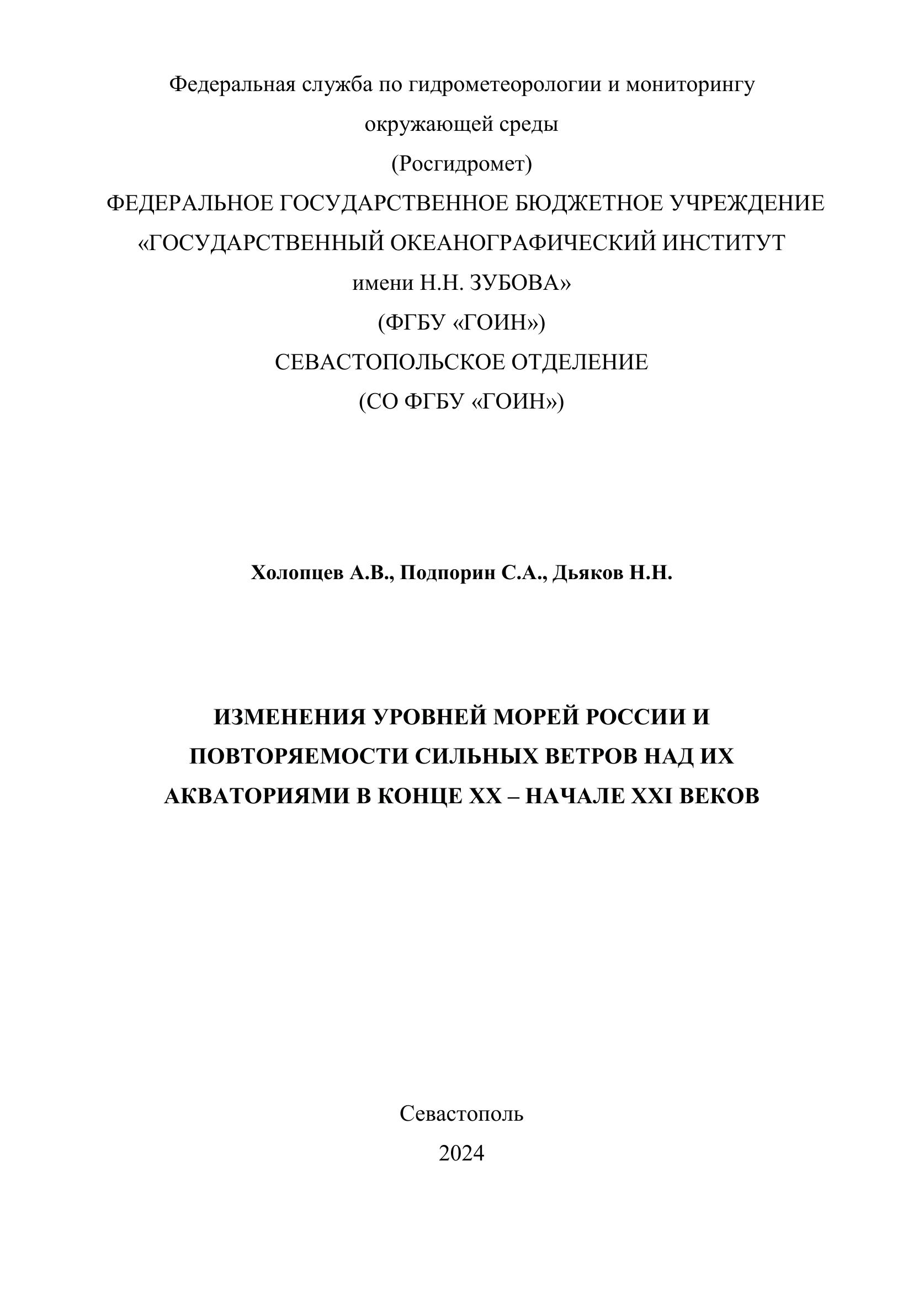 Холопцев А. В. Изменения уровней морей России и повторяемости сильных ветров над их акваториями в конце XX - начале XXI веков [Текст] : монография / А. В. Холопцев, С. А. Подпорин, Н. Н. Дьяков ; рец.: В. А. Сафонов, В. Н. Белокопытов, 2024. - 416 с.