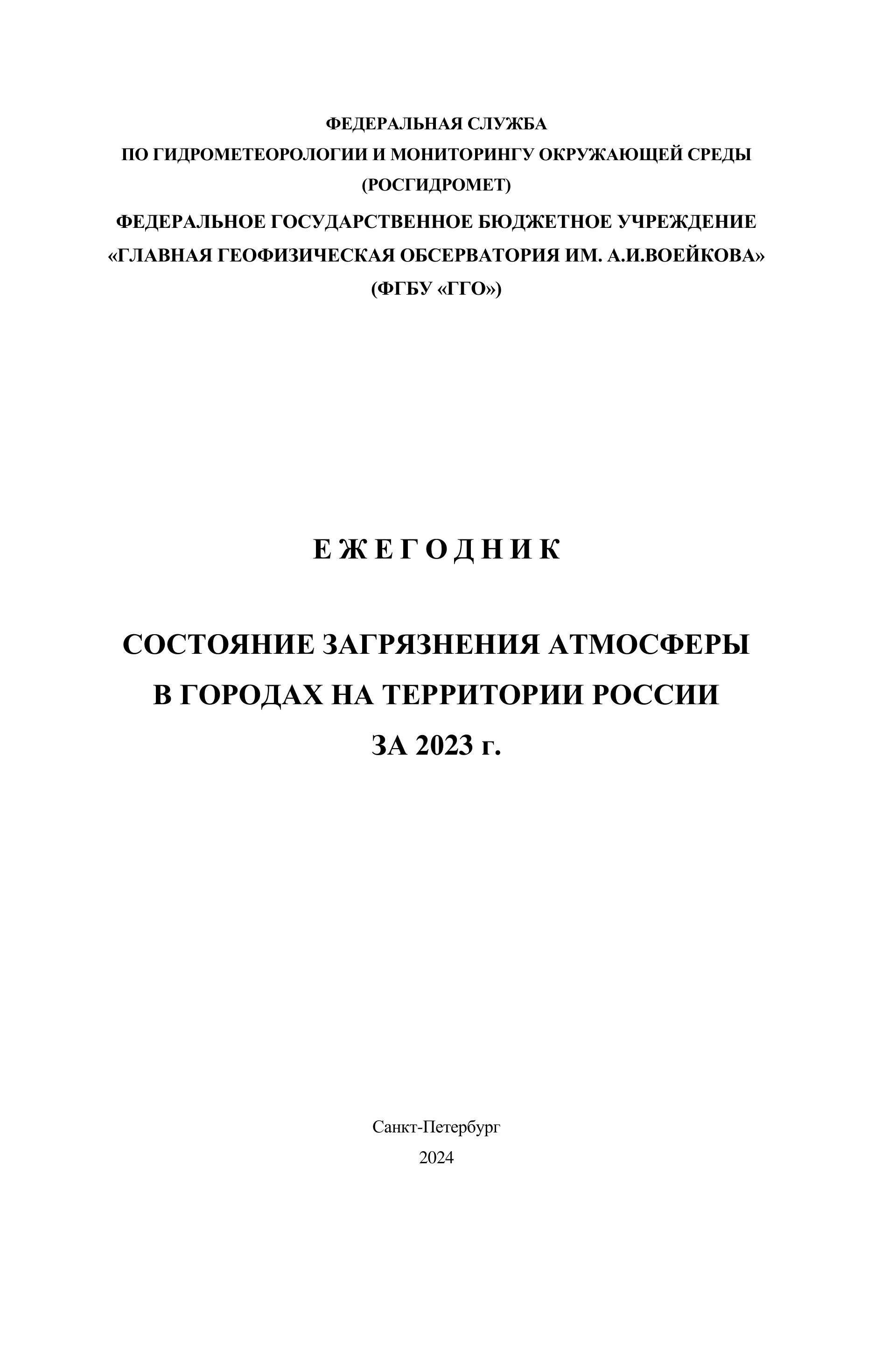Ежегодник. Состояние загрязнения атмосферы в городах на территории России за 2023 г. [Текст] : ежегодник / М. Л. Довольская , М. С. Загайнова, Т. П. Ивлева [и др.], 2024. - 265 с.