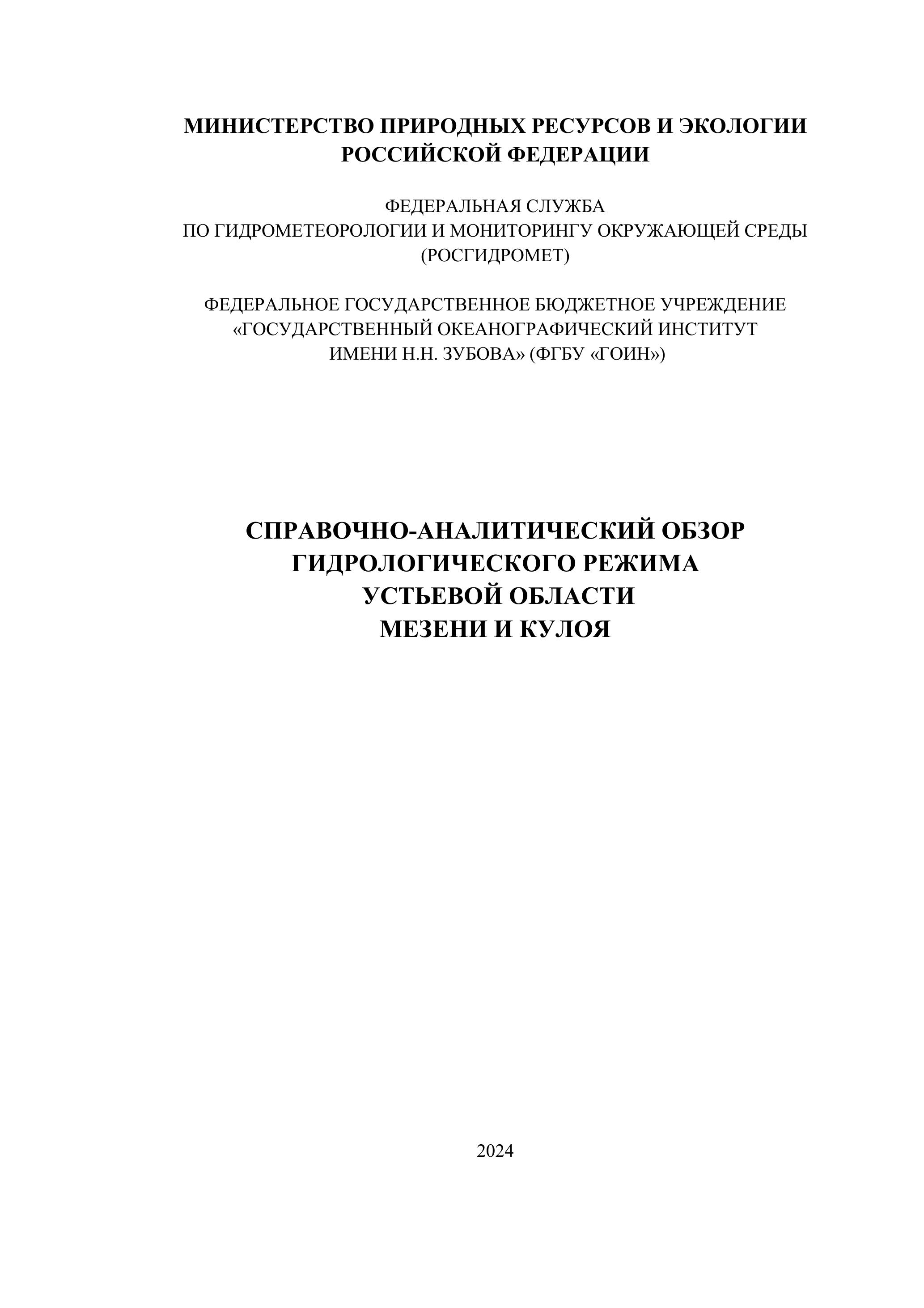 Справочно-аналитический обзор гидрологического режима устьевой области Мезени и Кулоя [Текст] : справочное издание / Н. А. Демиденко, О. В. Горелиц, А. А. Сапожникова [и др.] ; ред. Ж. М. Куликова ; рец. С. А. Добролюбов, 2024. - 390 с.