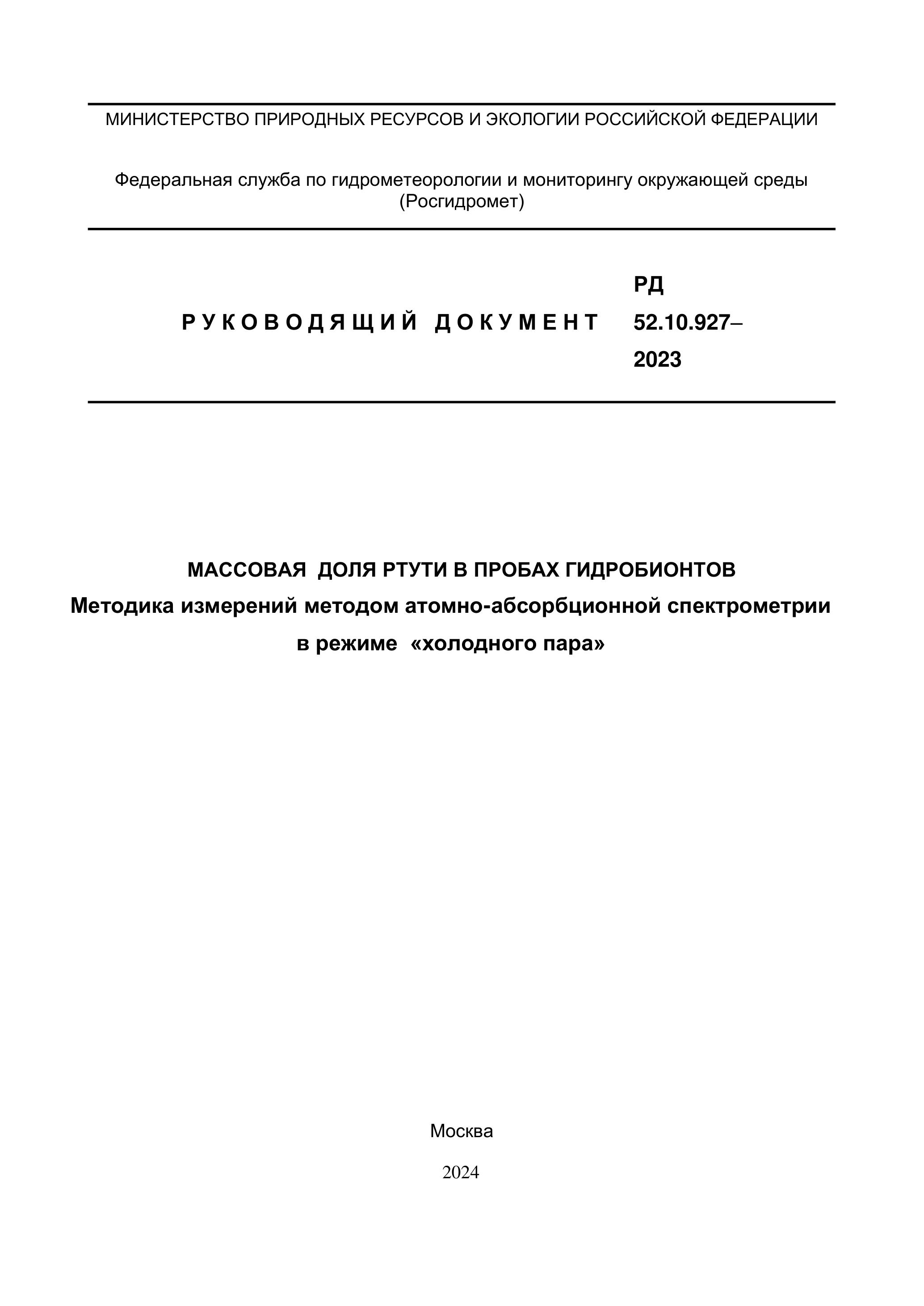 РД 52.10.927-2023 Массовая доля ртути в пробах гидробионтов. Методика измерений методом атомно-абсорбционной спектрометрии в режиме "холодного пара" [Текст] : Руководящий документ РД 52.10.927-2023 / ФГБУ "Государственный океанографический институт имени Н. Н. Зубова", 2024. - 24 с.