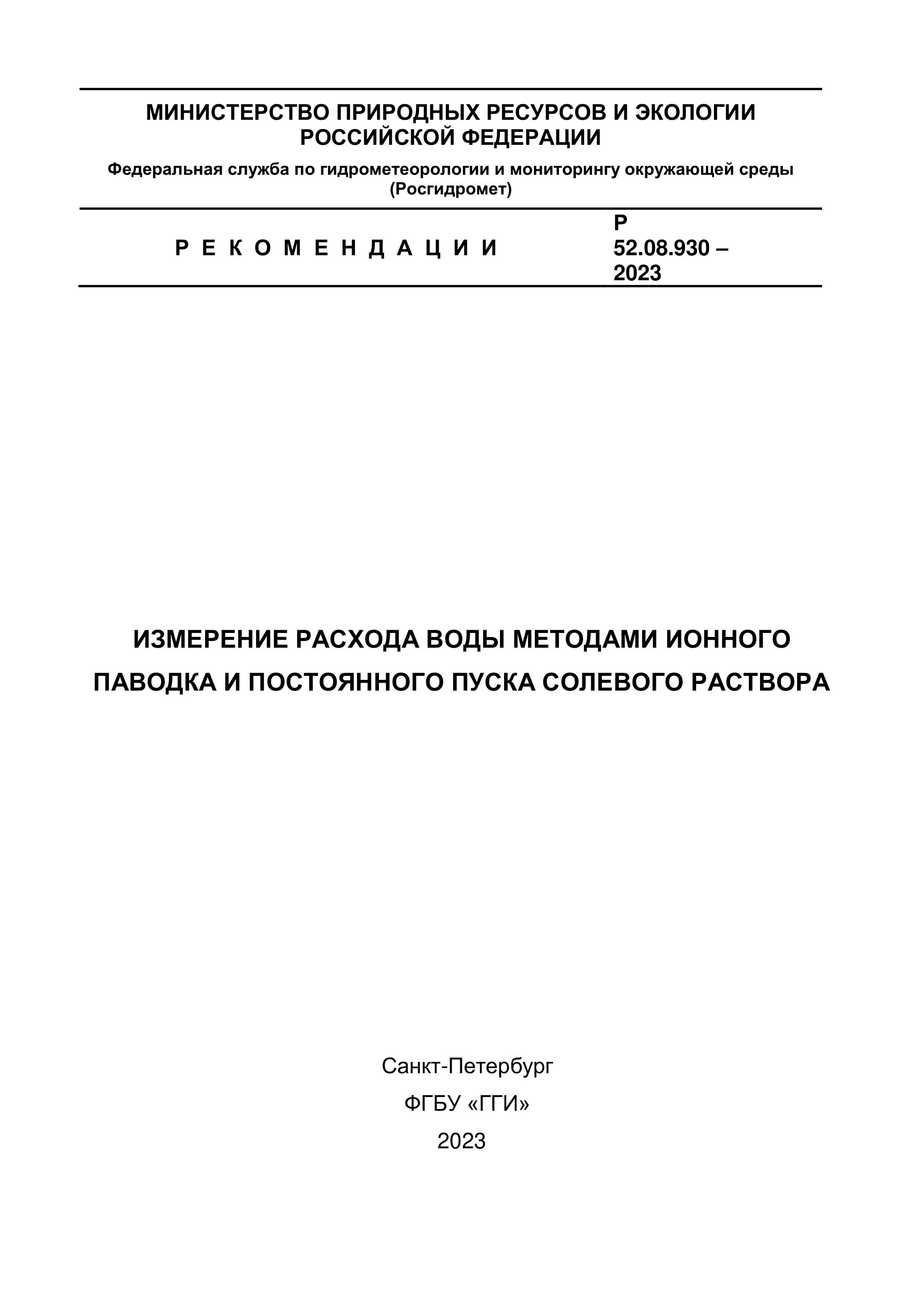 Р 52.08.930–2023 Измерение расхода воды методами ионного паводка и постоянного пуска солевого раствора [Текст] : Рекомендации Р 52.08.930-2023 / ФГБУ "Государственный гидрологический институт", 2023. - 84 с.