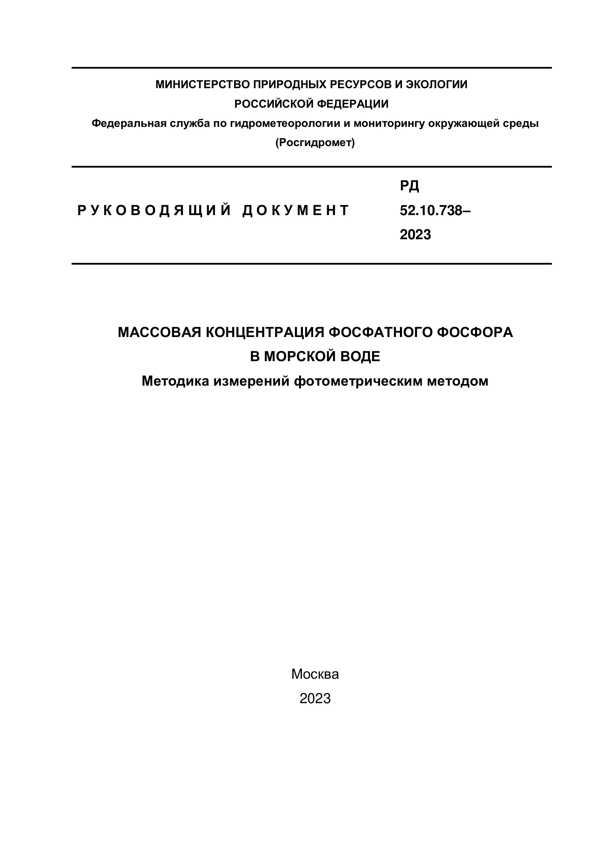 РД 52.10.738-2023 Массовая концентрация фосфатного фосфора в морской воде. Методика измерений фотометрическим методом [Текст] : Руководящий документ РД 52.10.738-2023 / ФГБУ "Государственный океанографический институт имени Н. Н. Зубова", 2023. - 25 с.