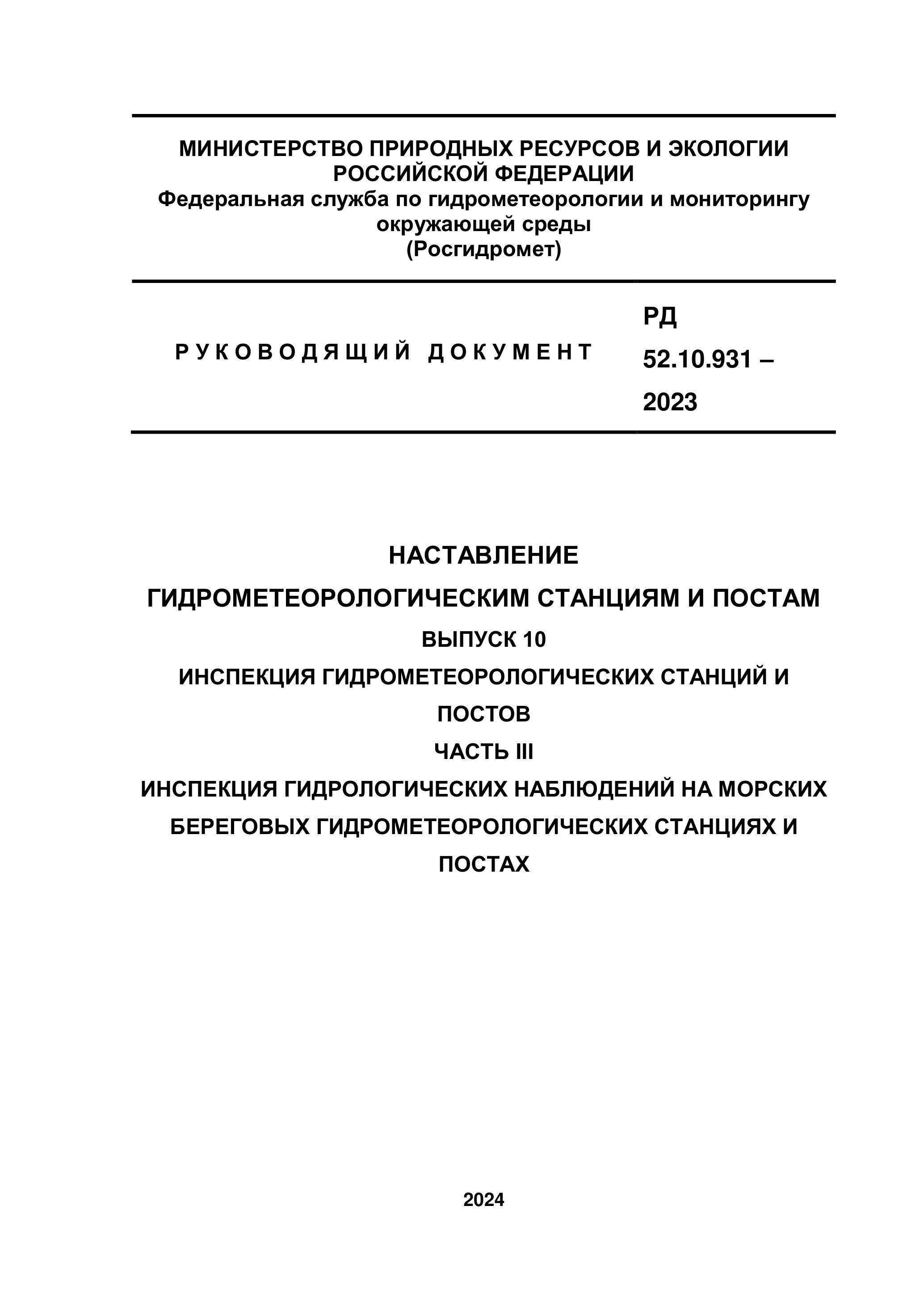 РД 52.10.931–2023 Наставление гидрометеорологическим станциям и постам [Текст] : Руководящий документ РД 52.10.931-2023. Выпуск 10. Инспекция гидрометеорологических станций и постов. Часть III. Инспекция гидрологических наблюдений на морских береговых гидрометеорологических станциях и постах / ФГБУ "Государственный океанографический институт имени Н. Н. Зубова", ФГБУ "Арктический и антарктический научно-исследовательский институт", ФГБУ "Всероссийский научно исследовательский институт гидрометеорологической информации-Мировой центр данных", 2024. - 148 с.