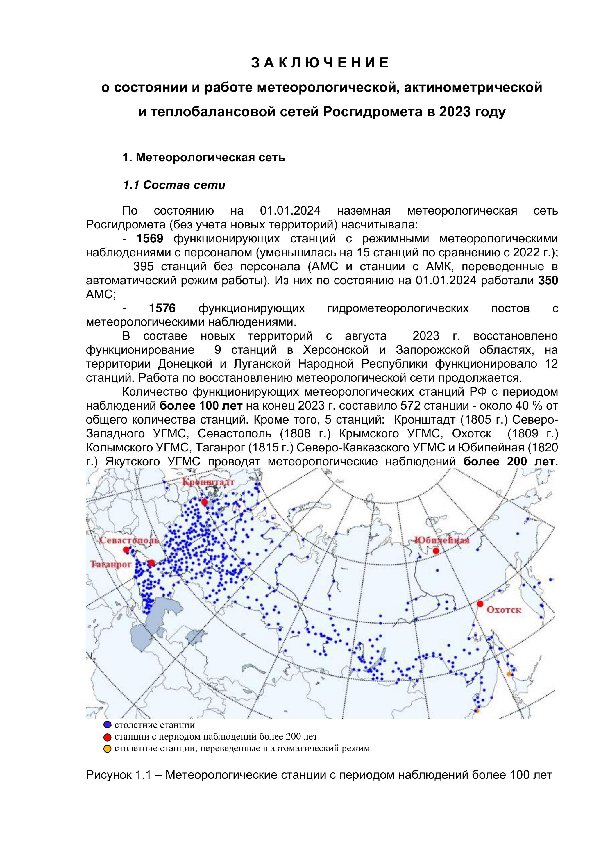 Заключение о состоянии и работе метеорологической, актинометрической и теплобалансовой сетей Росгидромета в 2023 году [Текст] / ФГБУ "Главная геофизическая обсерватория им. А. И. Воейкова". - 37 с.