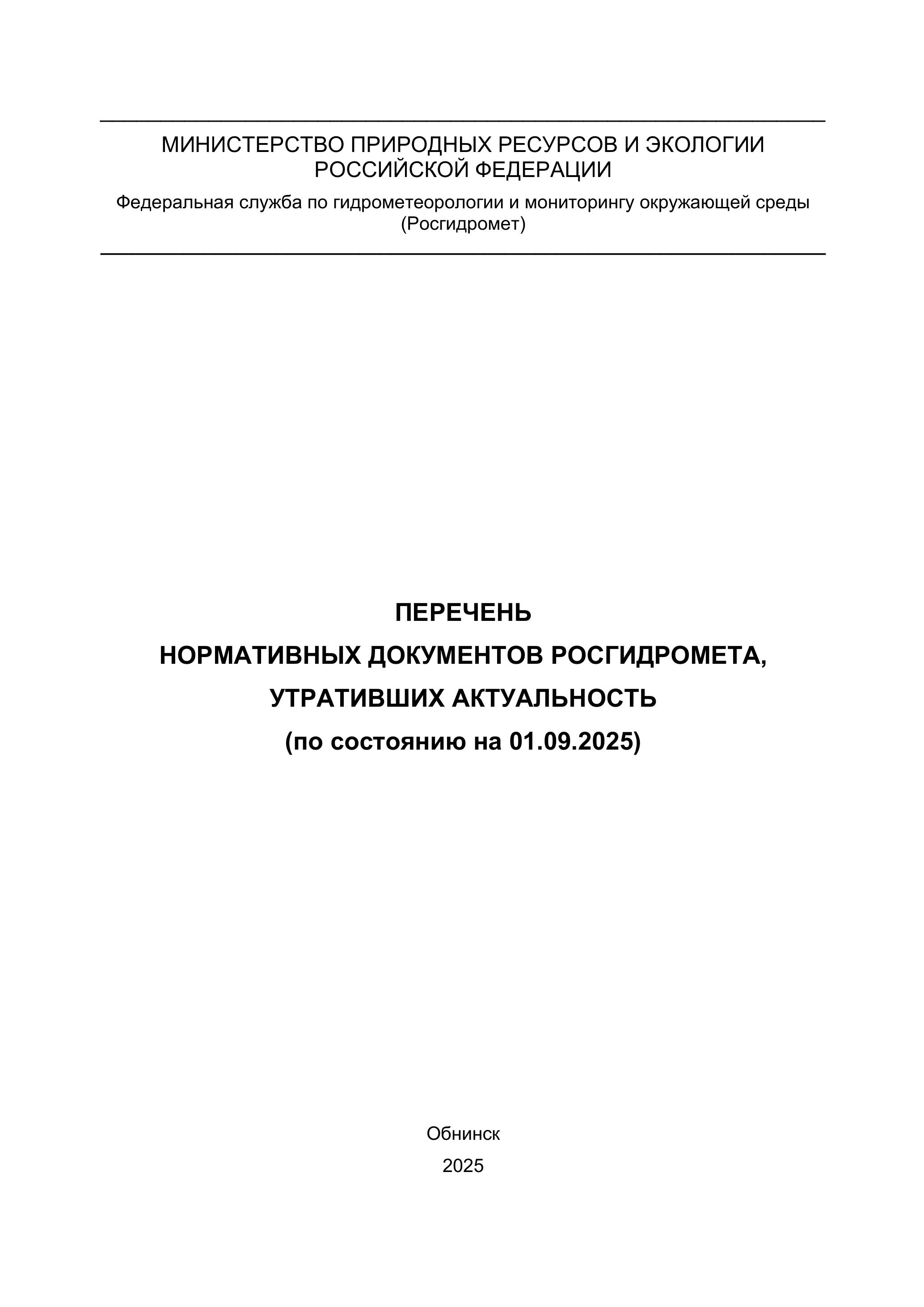 Перечень нормативных документов Росгидромета, утративших актуальность (по состоянию на 01.09.2025) [Текст] / ФГБУ "Научно-производственное объединение "Тайфун", 2025. - 28 с.