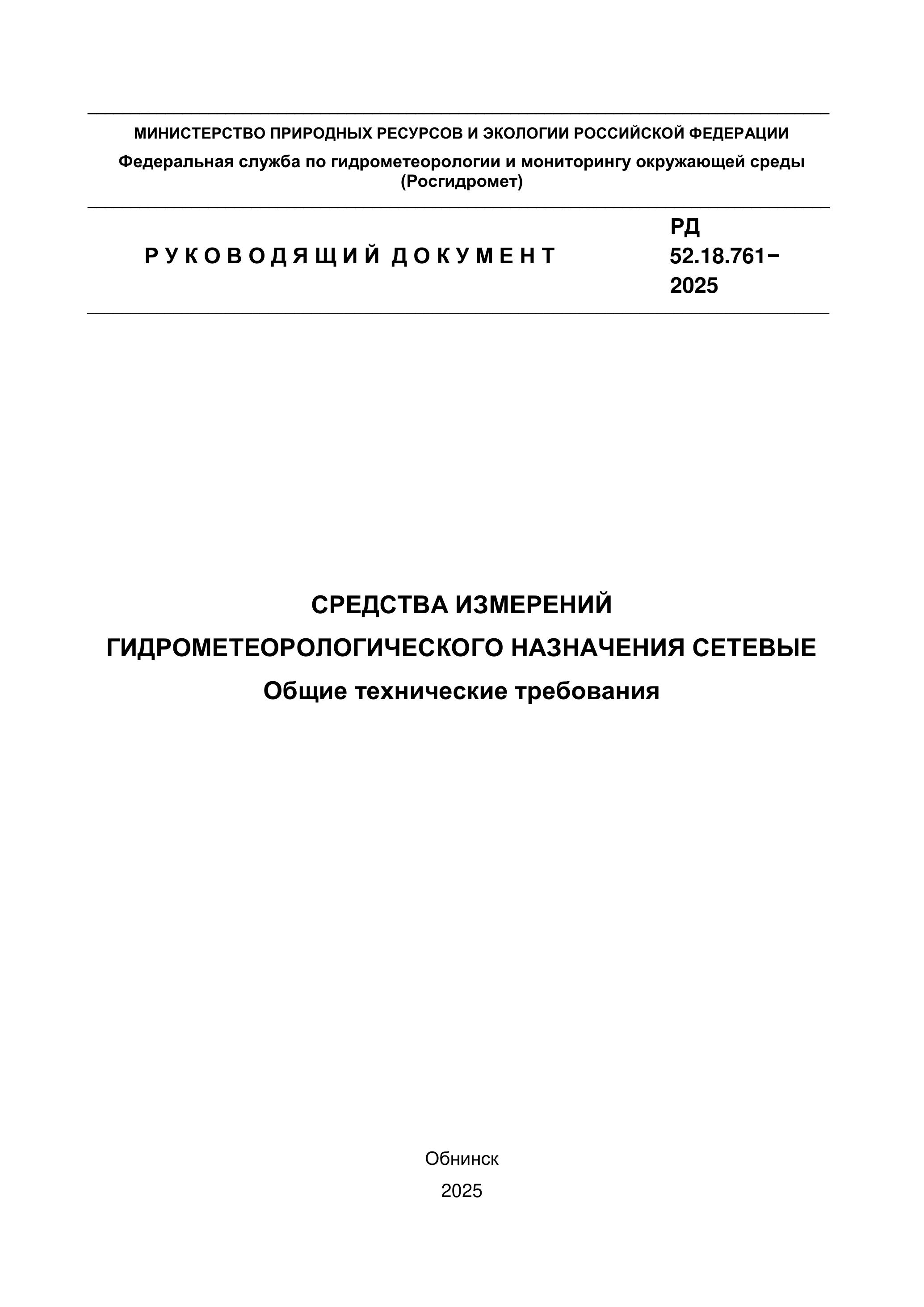 РД 52.18.761-2025 Средства измерений гидрометеорологического назначения сетевые. Общие технические требования [Текст] : Руководящий документ РД 52.18.761-2025 / ФГБУ "Научно-производственное объединение "Тайфун", 2025. - 33 с.
