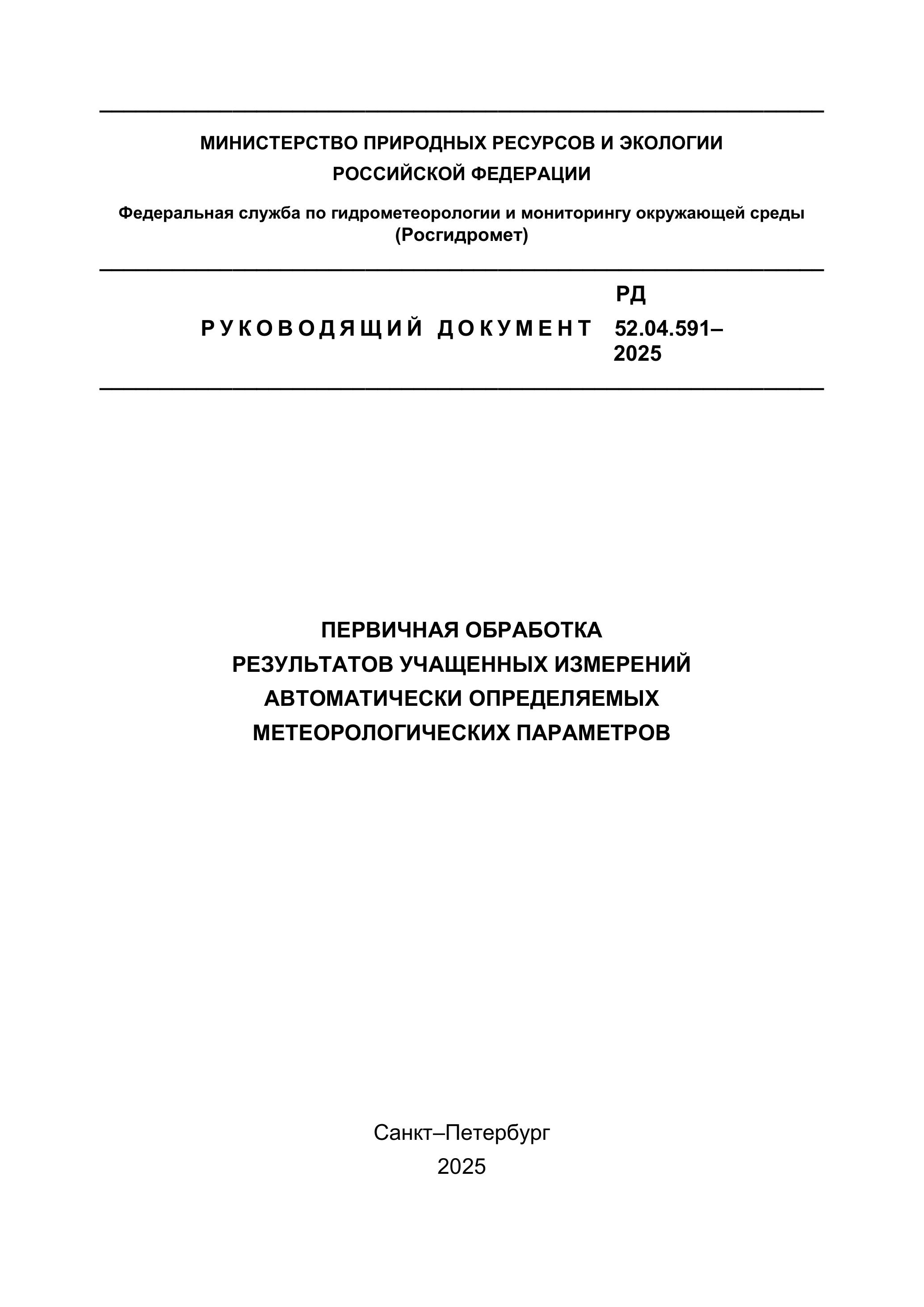 РД 52.04.591-2025 Первичная обработка результатов учащенных измерений автоматически определяемых метеорологических параметров [Электронный ресурс] : Руководящий документ РД 52.04.591-2025 / ФГБУ "Главная геофизическая обсерватория им. А. И. Воейкова", 2025. - 40 с.