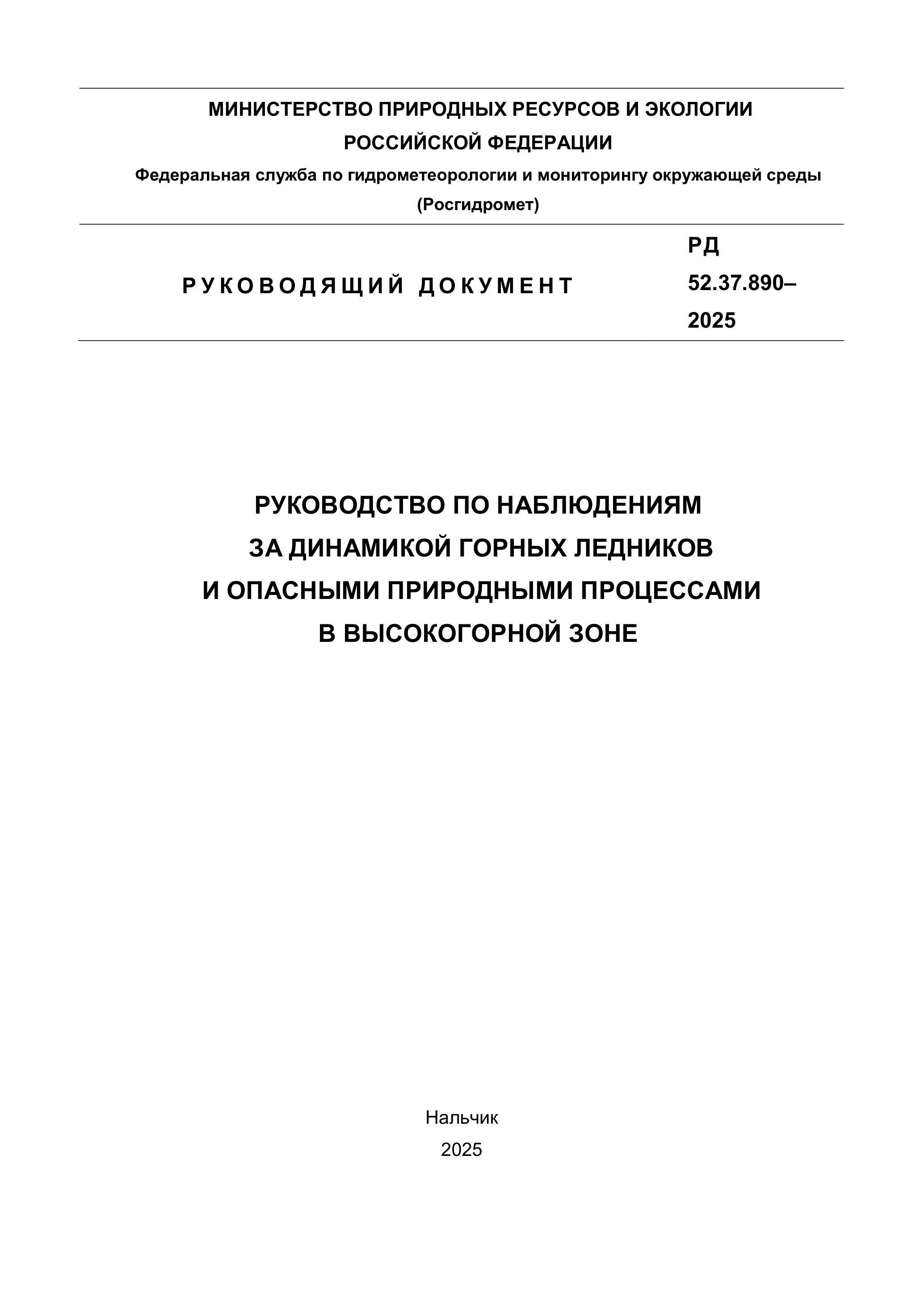РД 52.37.890-2025 Руководство по наблюдениям за динамикой горных ледников и опасными природными процессами в высокогорной зоне [Текст] : Руководящий документ РД 52.37.890-2025 / ФГБУ "Высокогорный геофизический институт", 2025. - 52 с.
