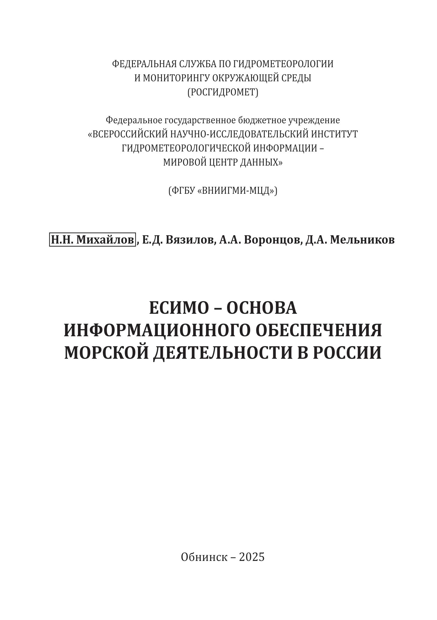 Михайлов Н. Н. ЕСИМО - основа информационного обеспечения морской деятельности в России [Текст] : монография / Н. Н. Михайлов, Е. Д. Вязилов, А. А. Воронцов, Д. А. Мельников ; рец. М. З. Шаймарданов , 2025. - 262 с.