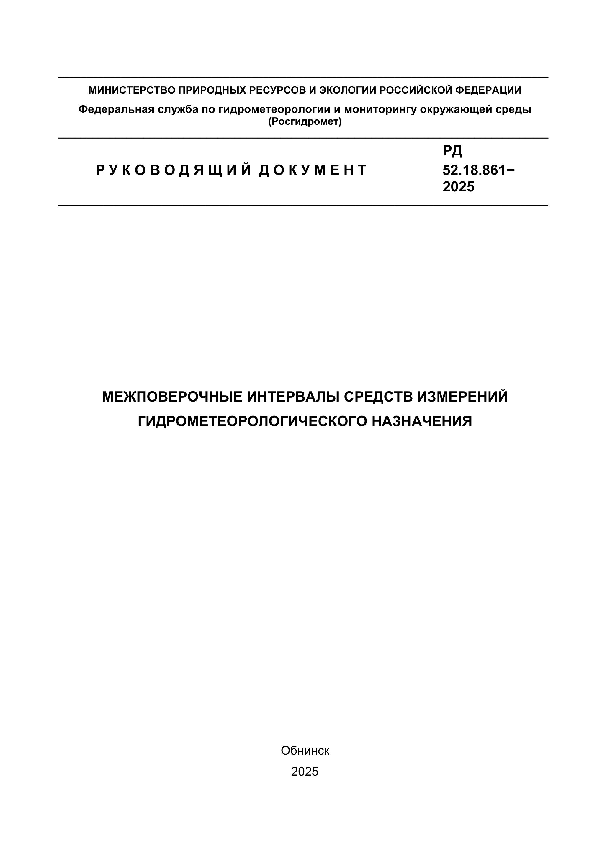 РД 52.18.861-2025 Межповерочные интервалы средств измерений гидрометеорологического назначения [Текст] : Руководящий документ РД 52.18.861-2025 / ФГБУ "Научно-производственное объединение "Тайфун", 2025. - 11 с.
