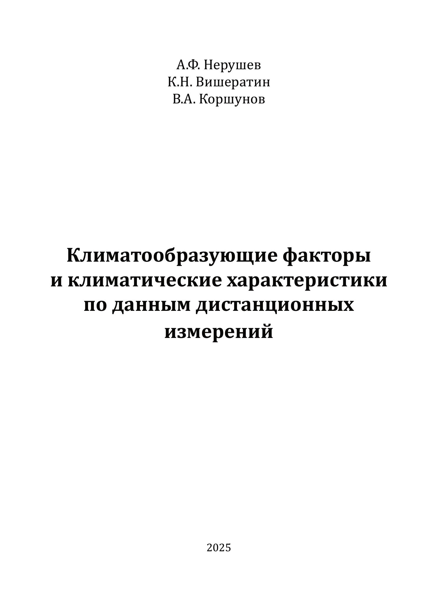 Нерушев А. Ф. Климатообразующие факторы и климатические характеристики по данным дистанционных измерений [Текст] : монография / А. Ф. Нерушев, К. Н. Вишератин, В. А. Коршунов ; рец.: С. М. Семенов, А. Б. Успенский, 2025. - 302 с.