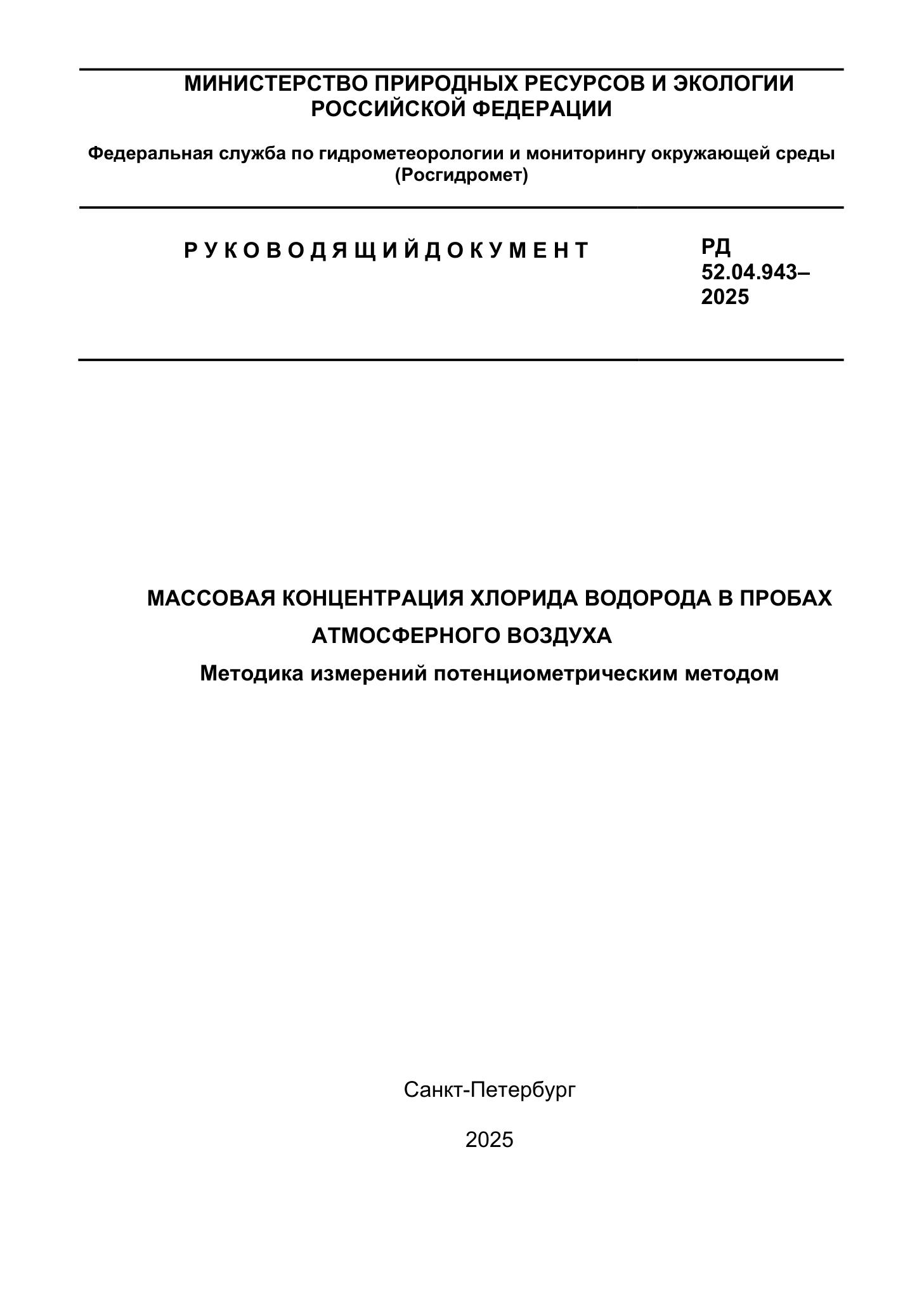 РД 52.04.943-2025 Массовая концентрация хлорида водорода в пробах атмосферного воздуха. Методика измерений потенциометрическим методом [Электронный ресурс] : Руководящий документ РД 52.04.943-2025 / ФГБУ "Главная геофизическая обсерватория им. А. И. Воейкова", 2025. - 40 с.